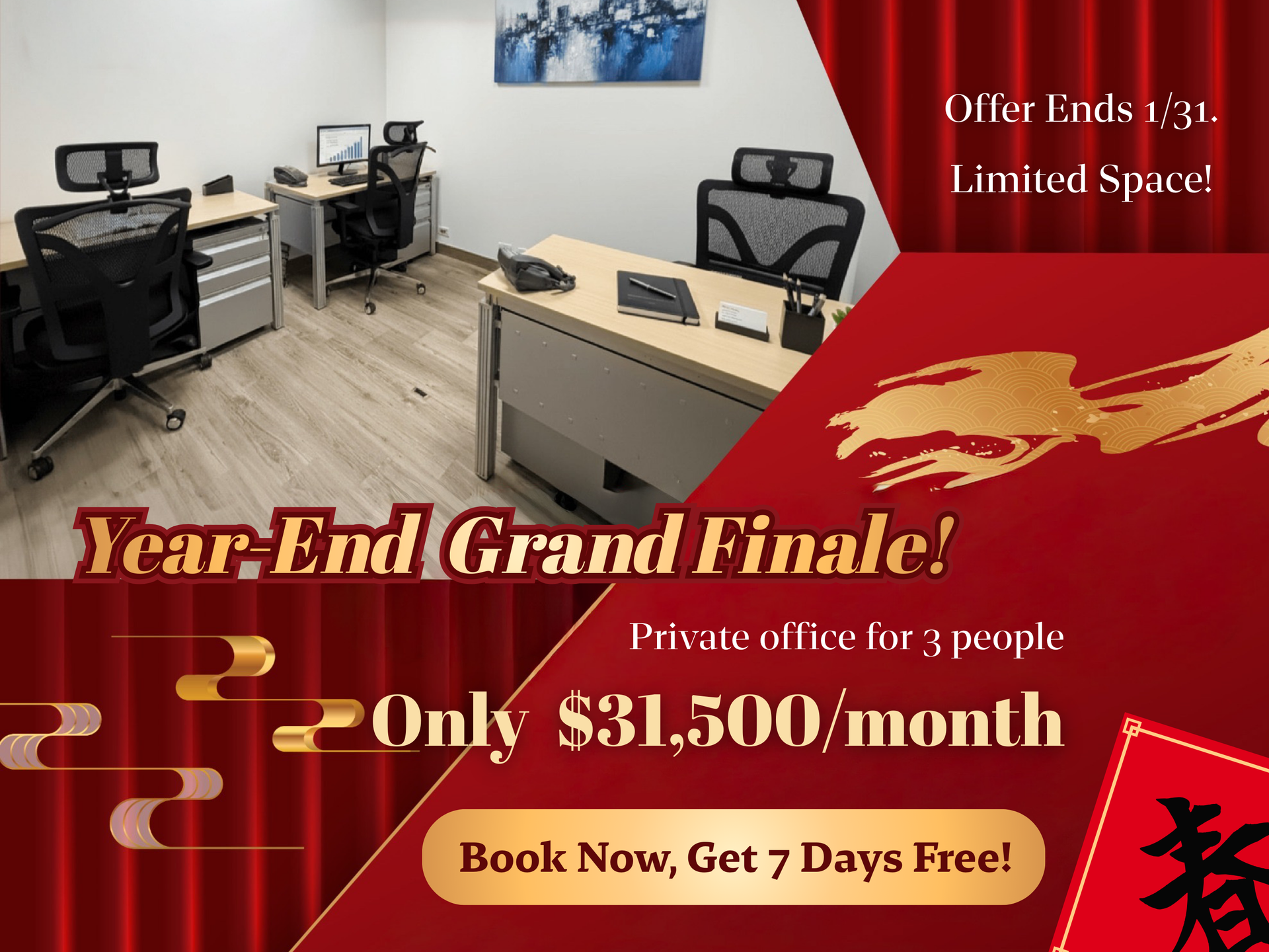 The rooms vary in sizes that can accomodate two to eight people comfortably. Rooms can be rented under flexible terms from one month to one years. In addition, the businss center also offers meeting rooms and virtual office solutions.